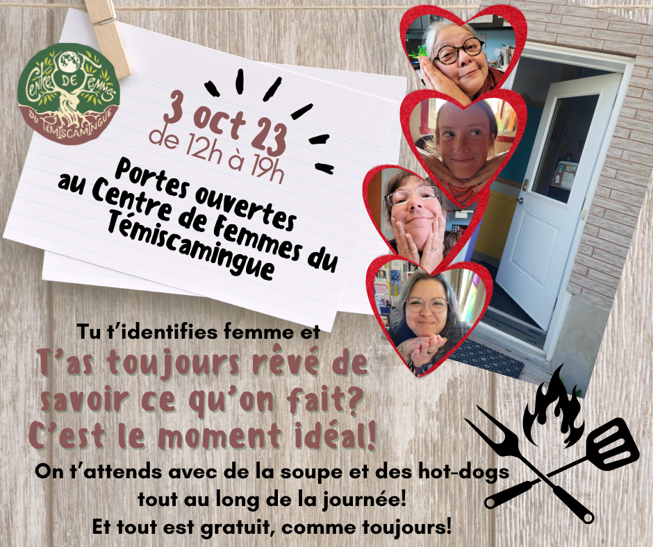 Activité Journée Portes-ouvertes au 3 octobre 2023 12h à 19h Centre de Femmes du Témiscamingue - 28, Notre-Dame de Lourdes à Ville-Marie Gratuit