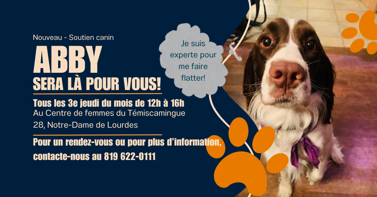 Activité Soutien canin avec Abby 20 mai au 20 juin 2025 12h à 16h Centre de Femmes du Témiscamingue - 28, Notre-Dame de Lourdes à Ville-Marie Gratuit