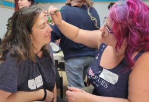 Suite à ces discussions, les participantes étaient invitées à découvrir les pouvoirs de sorcières/de femmes, avec des documents comme “45 types de sorcières” et des cartes symbolisant le féminin et l’animal qui leurs correspondaient. Elles se sont même prêter au jeu de trouver leurs parures et leurs couleurs comme le démontre la photo qui suit.